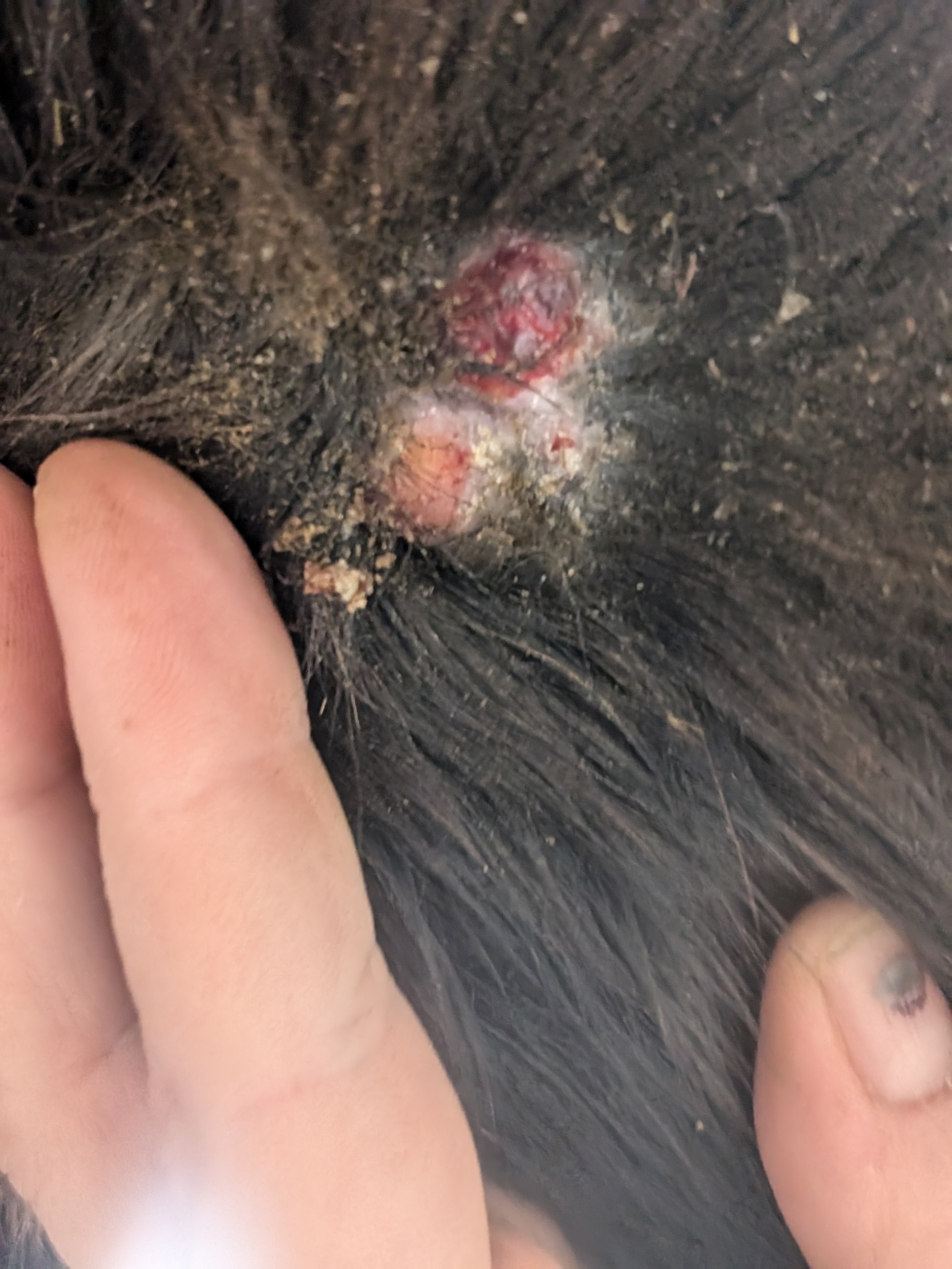 So sah es noch vor einigen Tagen aus, es bildet sich immer wieder eine Kruste, aber Romi tritt oft davor und dann ist es blutig und offen.