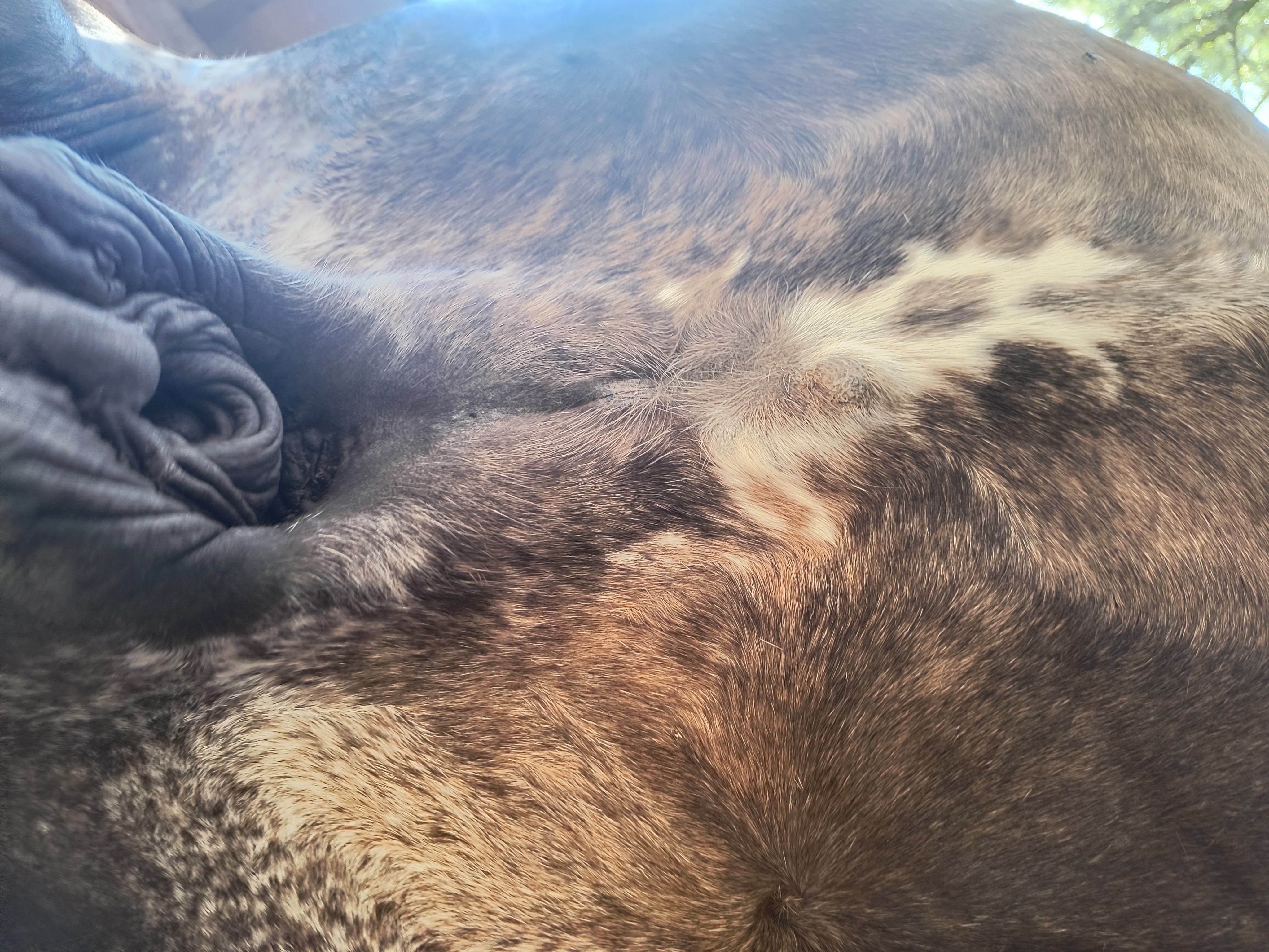 Vor einer Woche war der Tierarzt da und hat meine Befürchtung eines Sarkoids bestätigt. Er hat mir SangroXX dagelassen, und damit soll ich ihn nun täglich eincremen. Außerdem hat er noch eine verdächtige Stelle Richtung Schlauch entdeckt. Diese soll ich ebenfalls einschmieren.