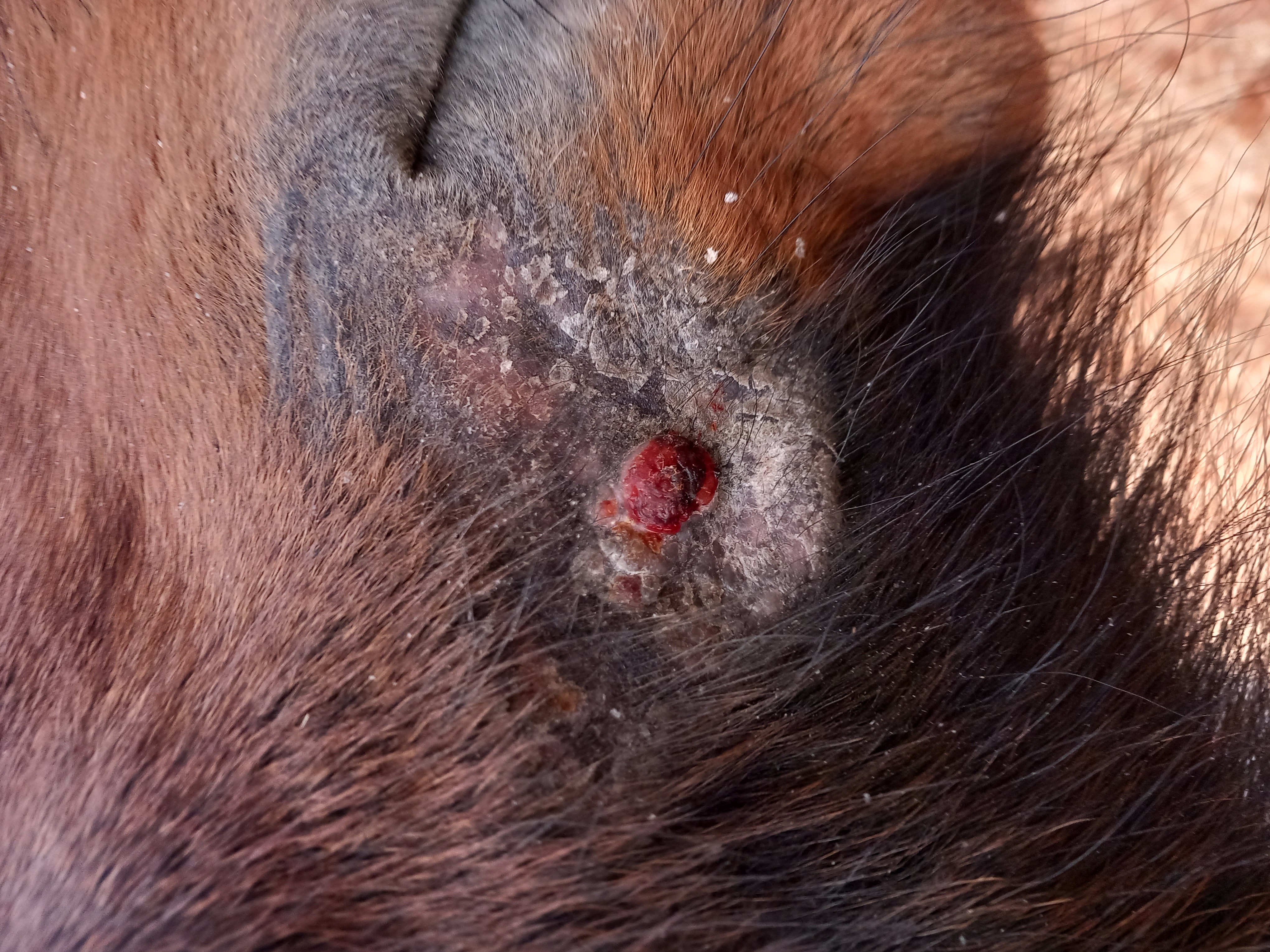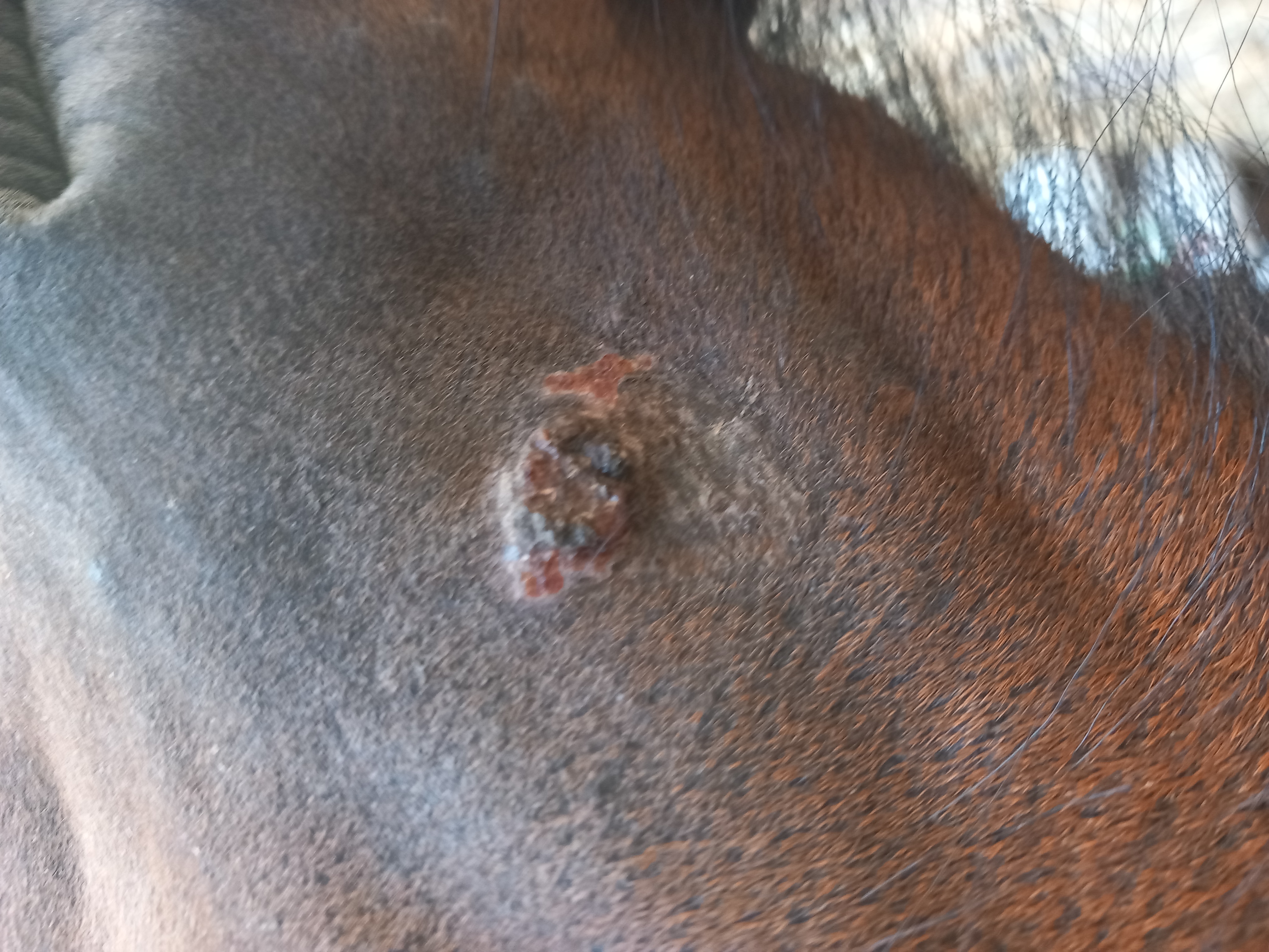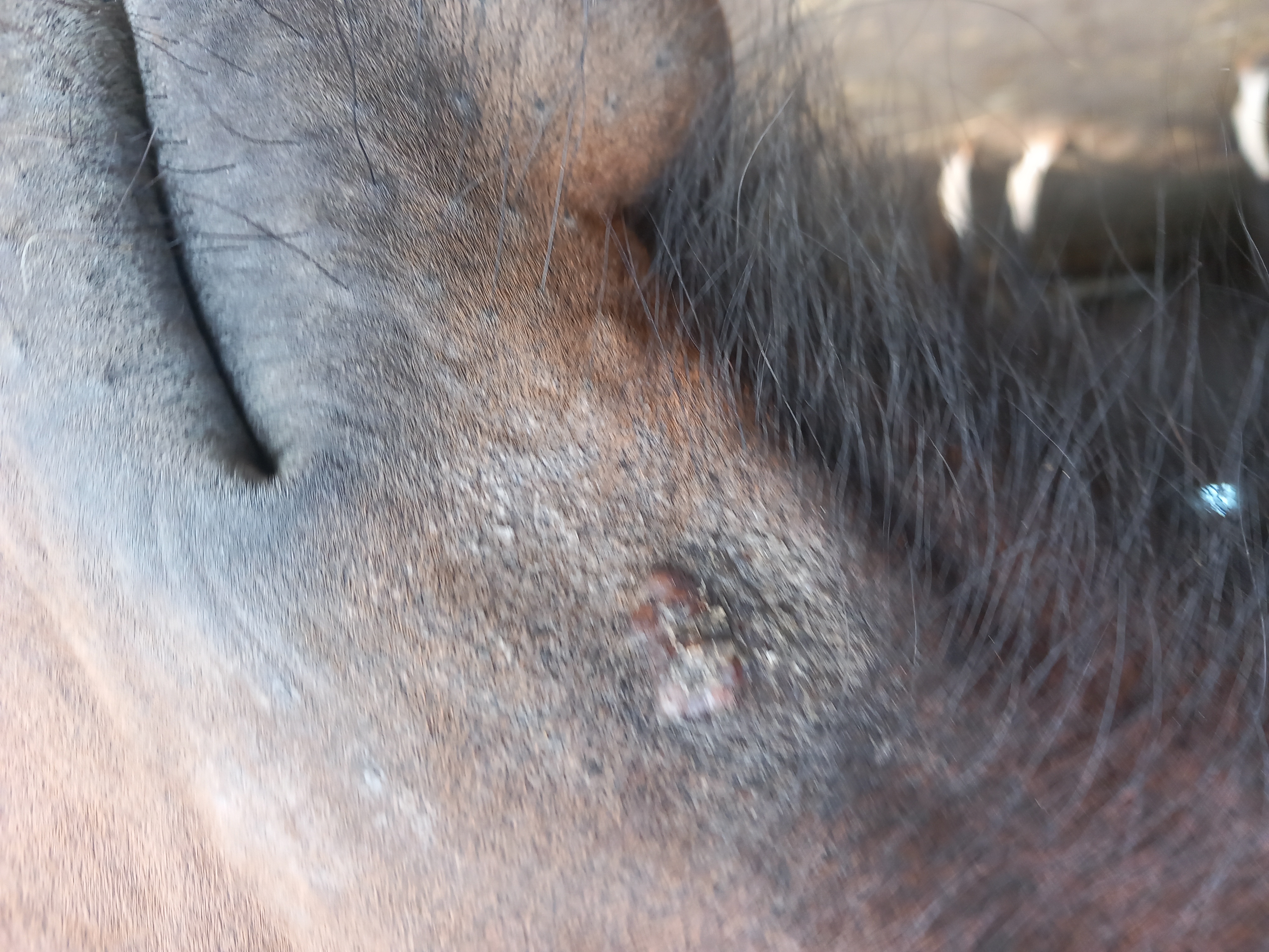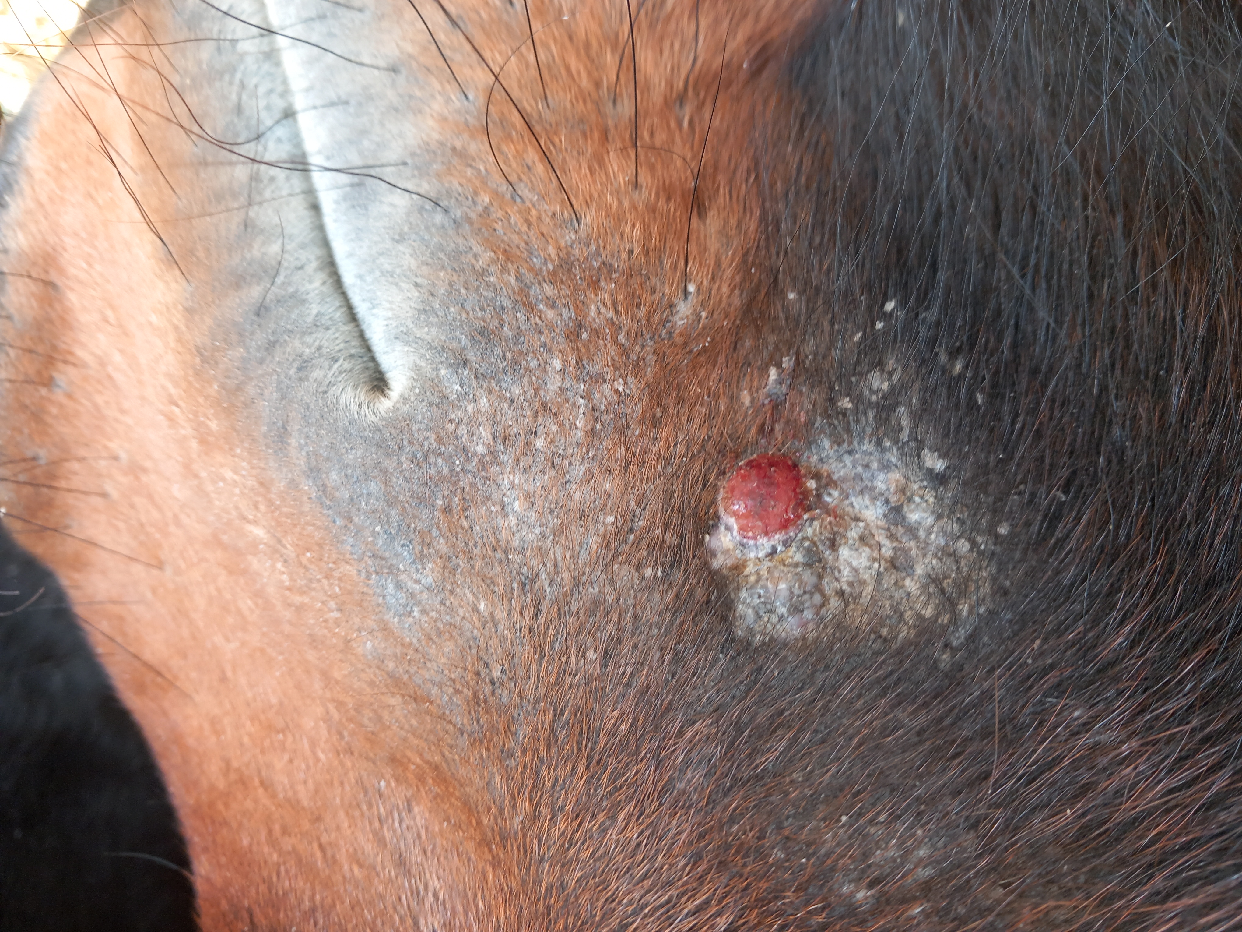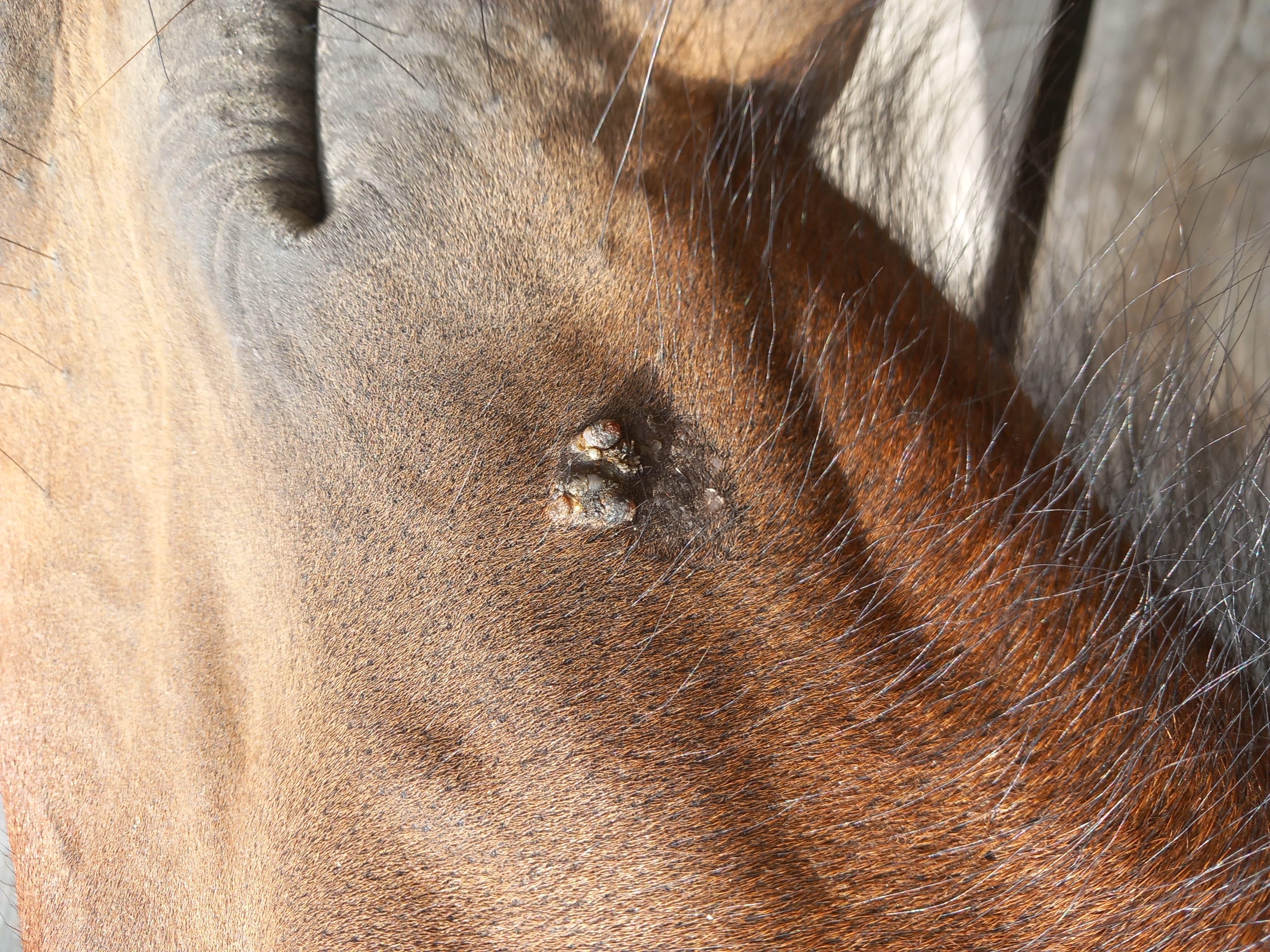 Meine 3,5 jährige Freibergerstute hat, seit ca. 7 Monaten, ein Sarkoid am Kopf.