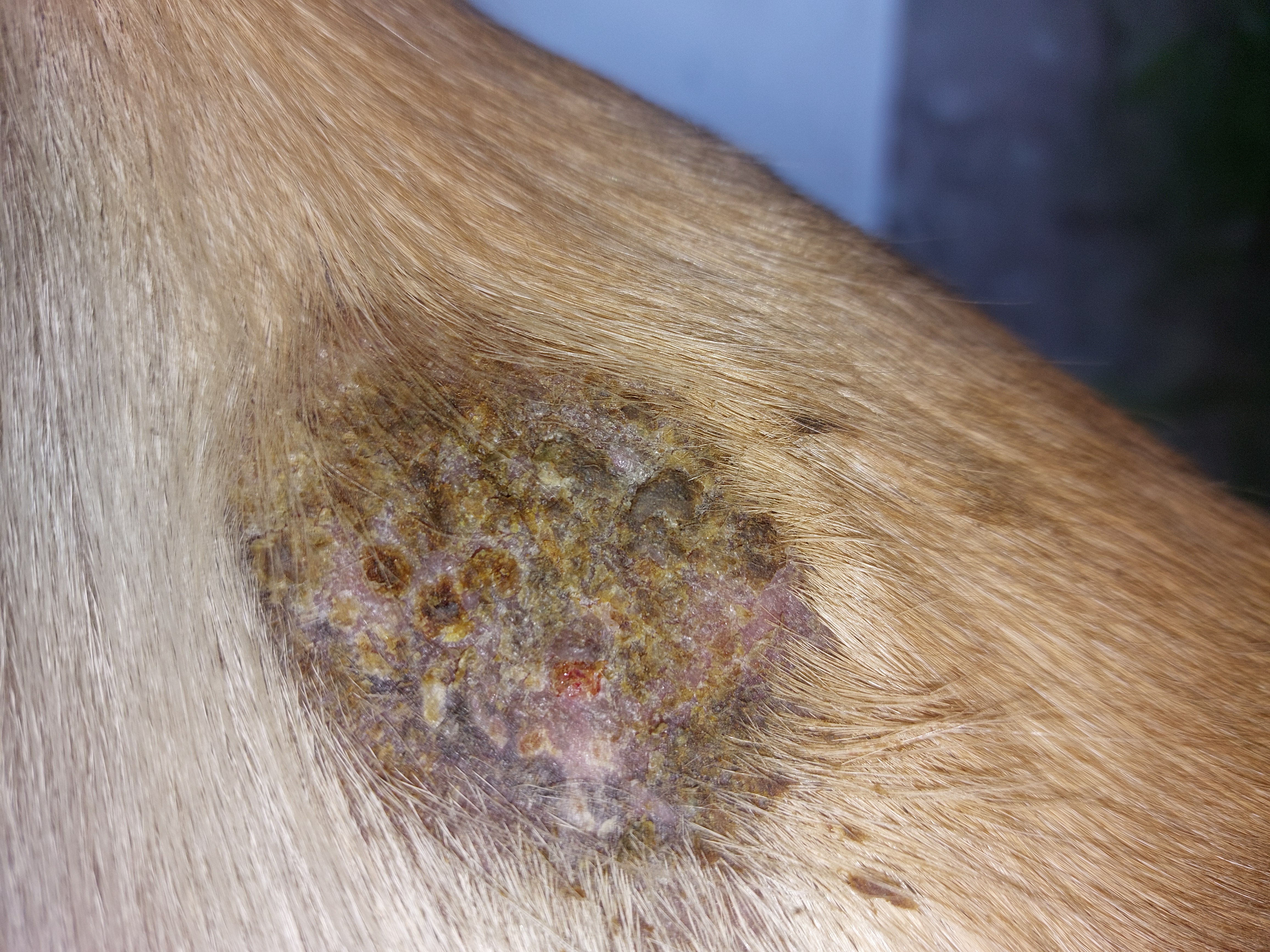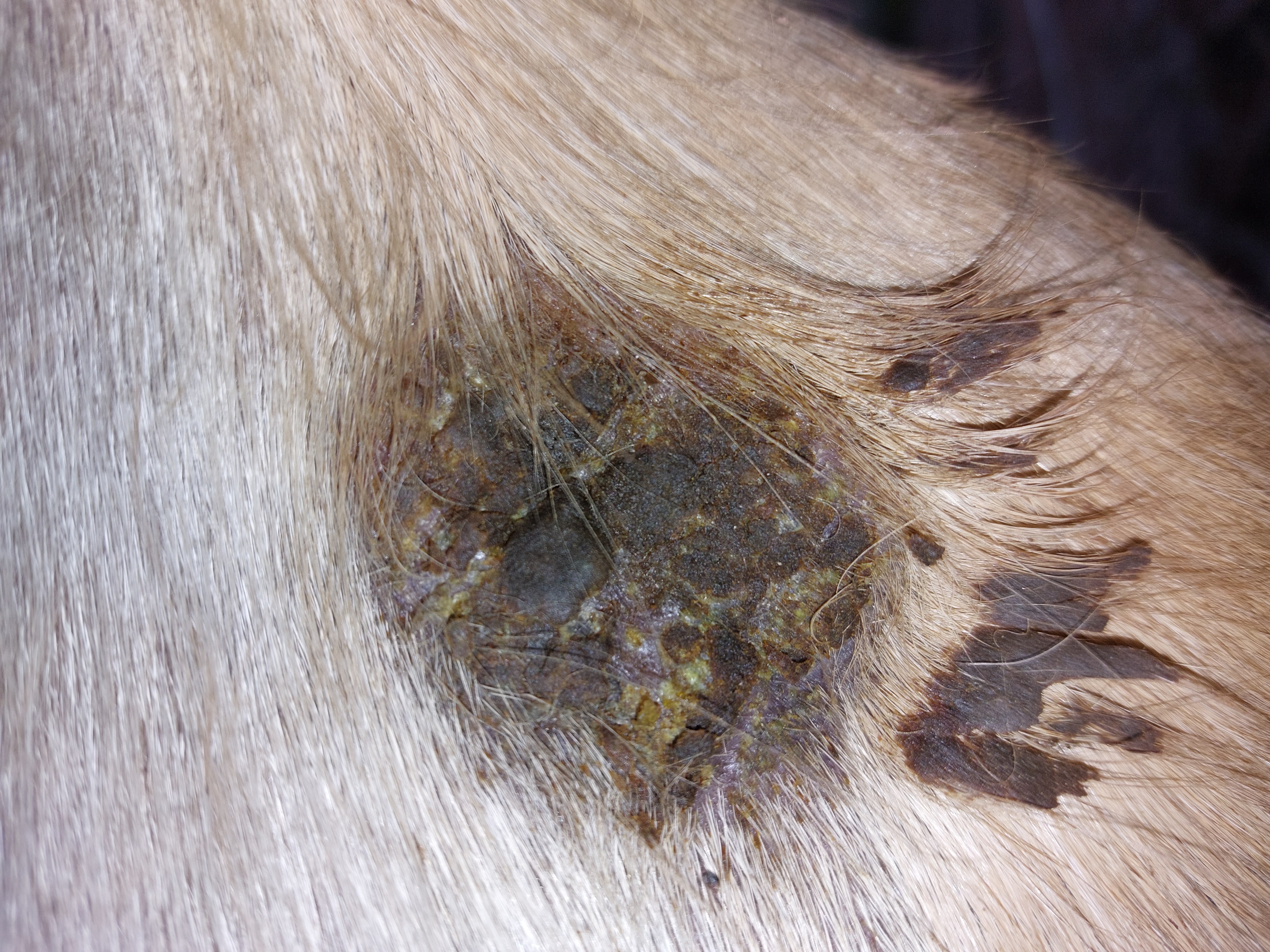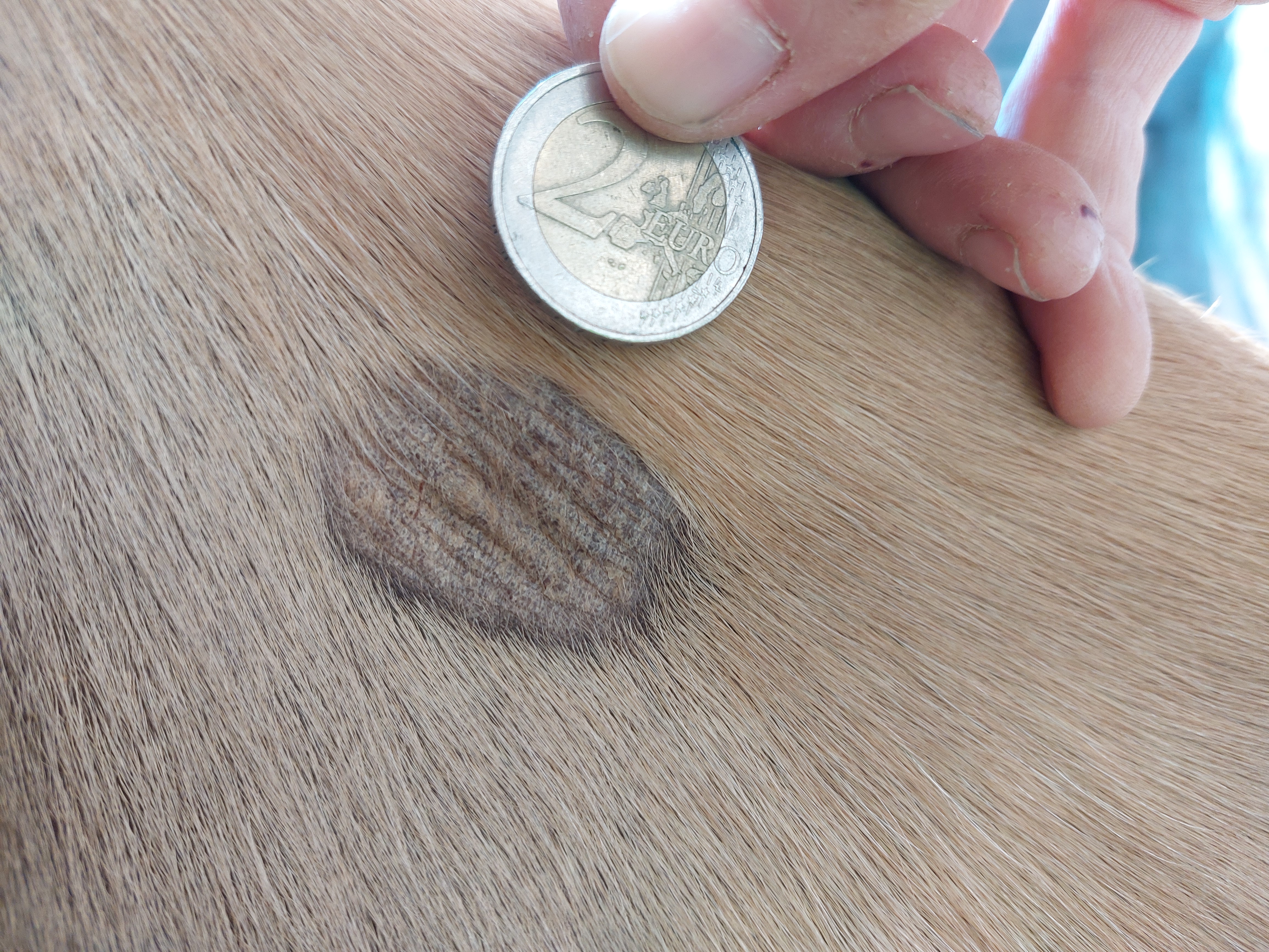 mein Pferd hat eine Hautveränderung an der Inneseite Oberschenkel. Der TA vermutete im April diesen Jahres, es könne ein Sarkoid sein, ich solle es beobachten, ob es wächst/ sich verändert. Im Beobachten bin ich nicht so gut, mache mir dann trotzdem Gedanken/Sorgen etc. Also habe ich gedacht, besser frühzeitig los werden, wenn's irgendwie geht. Von April bis September habe ich mit Sarkosense behandelt und damit ein anderes kleines warziges Sarkoid komplett weg bekommen. Das flächige in der Beininnenseite ist zwar mal farblich etwas rosaner geworden, aber hat sich ansonsten über die Monate nicht verändert. Seit November behandel ich es mit CompX, darauf reagiert die Haut mit Krustenbildung und auch gelblichem Sekret. Leider ist die Stelle seitdem auch etwas gewachsen. Ich wollte Euch mal den Verlauf der letzten Wochen zeigen und um Rückmeldung bitten, ob das in die richtige Richtung geht oder ob ich etwas ändern soll. Bisher schmiere ich CompX (50% mir Vaseline) ca. 5 mal die Woche dünn auf die Stelle. Wenn es ganz arg krustig ist, lasse ich mal einen Tag ausfallen. Weh scheint es nicht zu tun, Herr Ponymann lässt mich problemlos da dran.