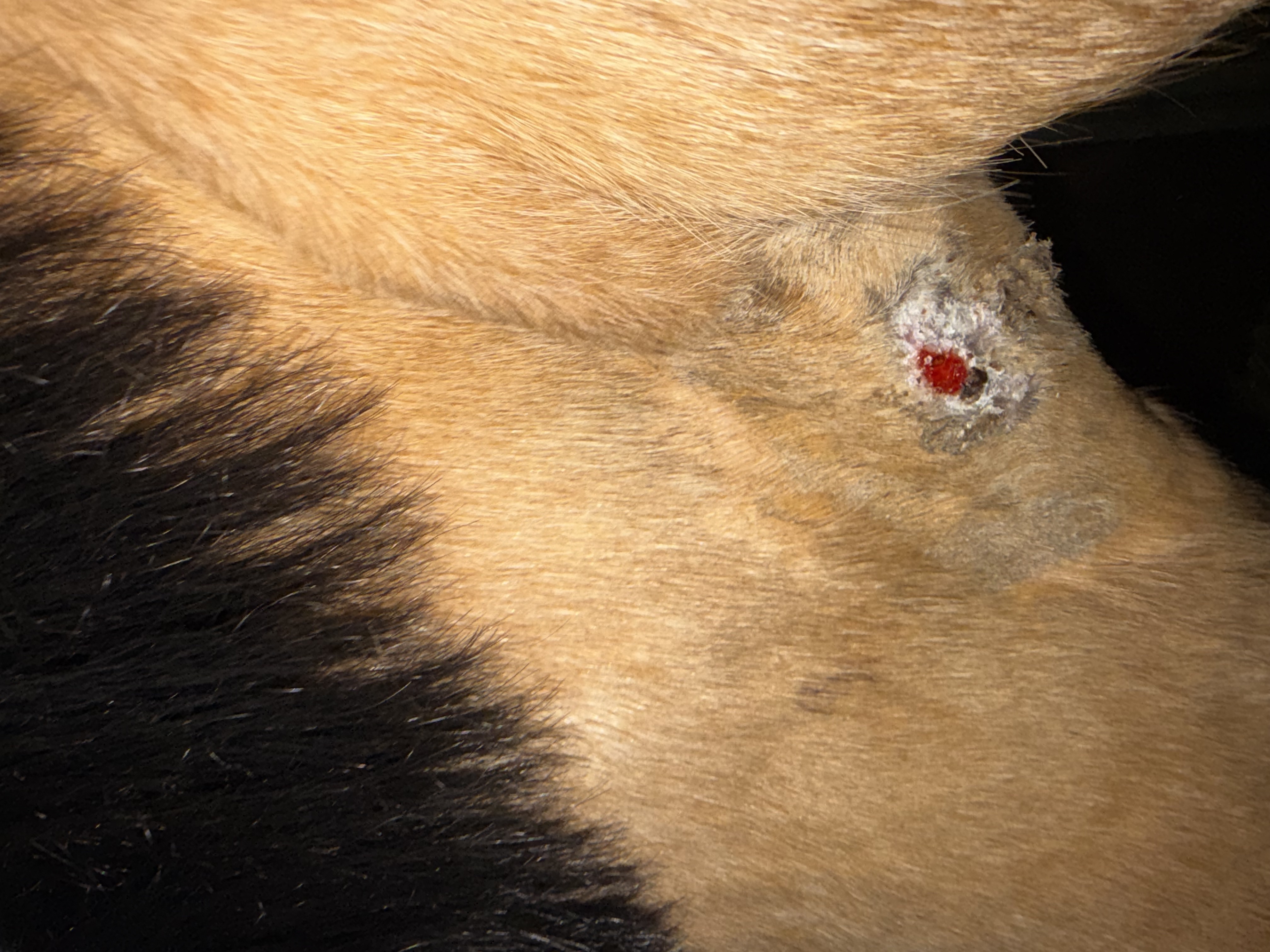 Gestern sah das Sarkoid so aus. Eigentlich sieht es ja nur blutig und nicht wie sonst auch eitrig aus. Ich hätte gedacht, dass wir warten, aber ich bin mir unsicher, ob wir nicht doch schmieren müssten? Was denkst Du?