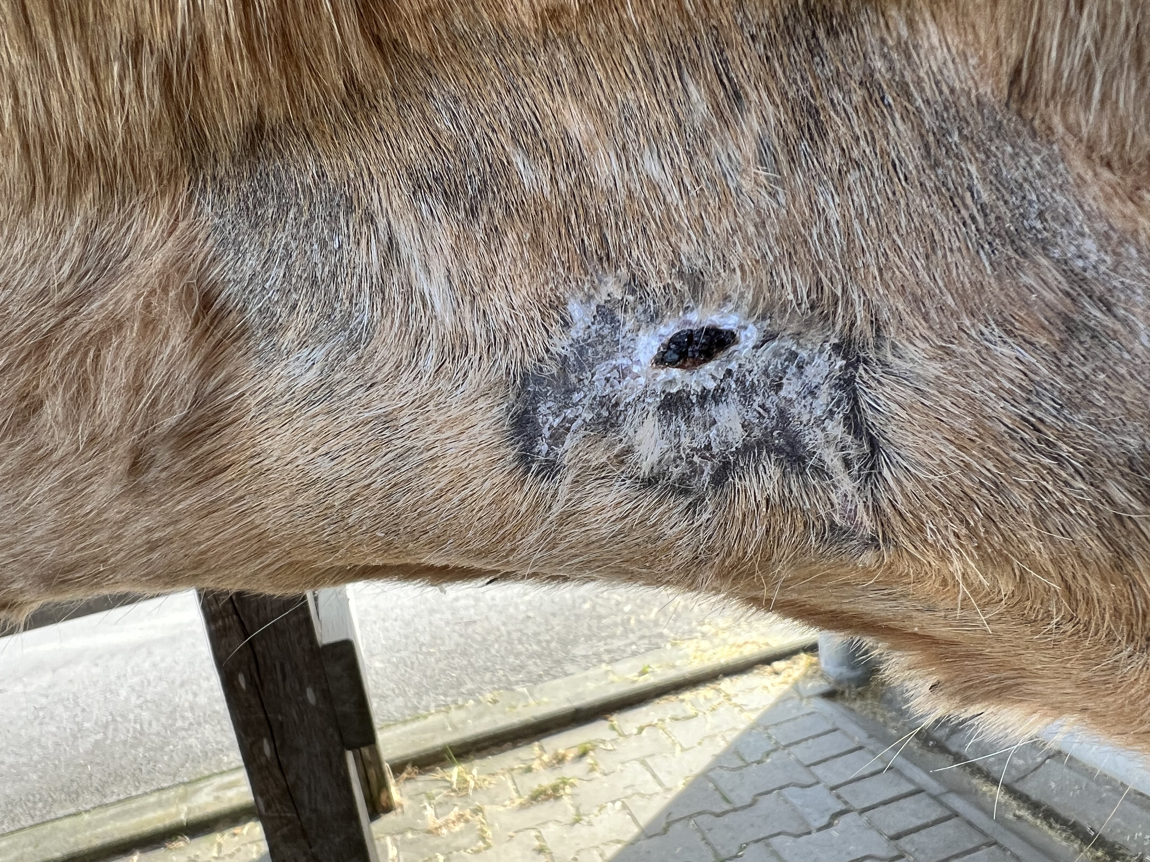 Da das Fell ultra schnell wächst und wir so die kleinen Stellen schnell nicht mehr unter dem Fell sehen können und sie uns nach wie vor ohne Sedierung nicht an die Stelle lässt, haben wir die Sedierung genutzt und die kritischen Stellen noch einmal mit Dermequine eingeschmiert.