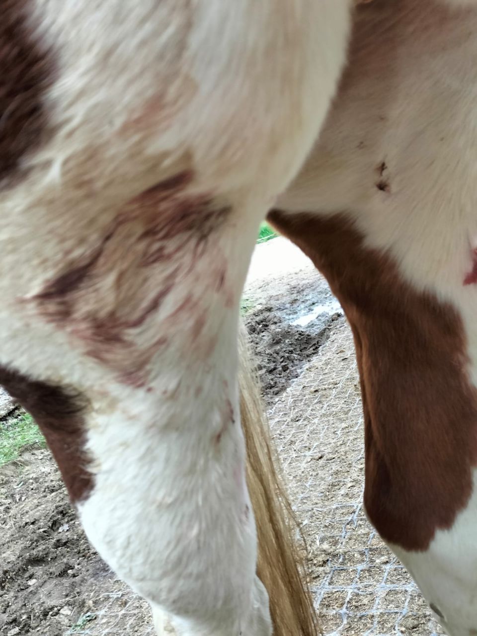 Gestern nun bekam ich von einer Stallkollegin Fotos geschickt, auf dem das Sarkoid eindeutig geplatzt war. Die Beine waren mit Sekret und Blut beschmiert und auch ein kleines Zipfelchen war deutlich auf dem Bild zu erkennen.