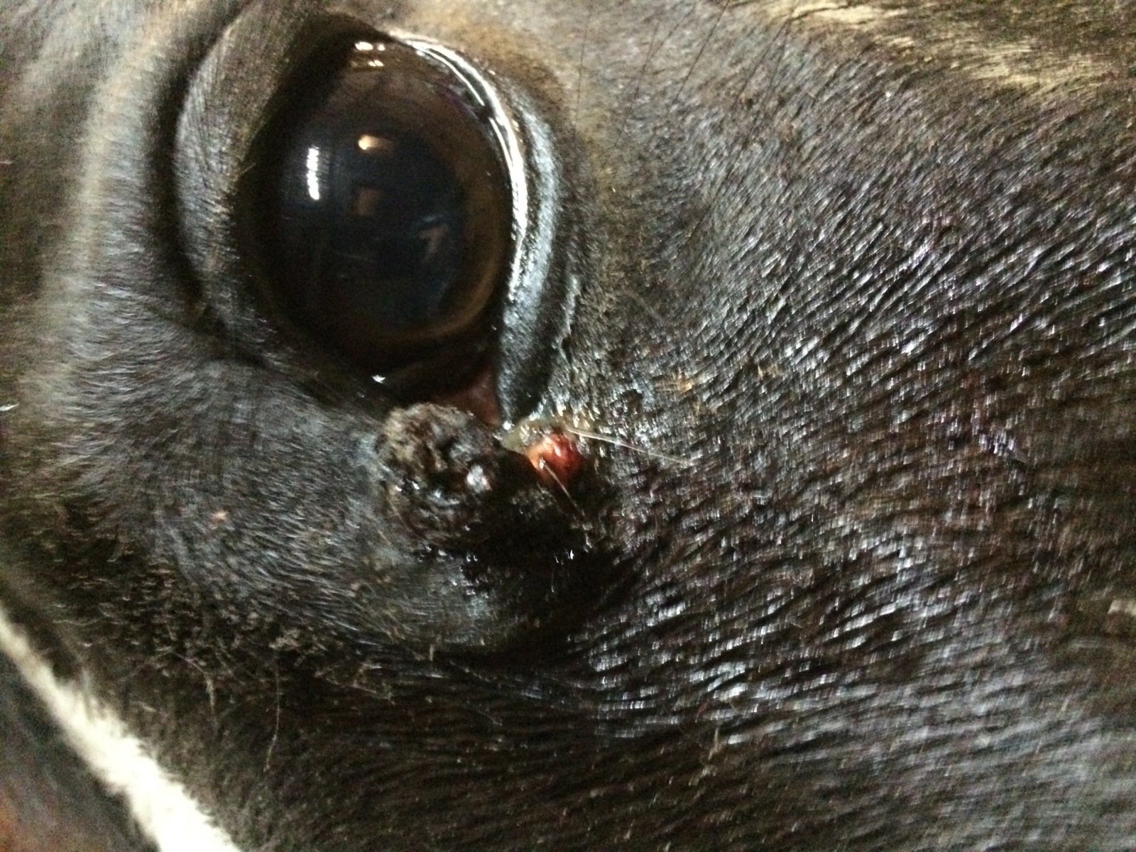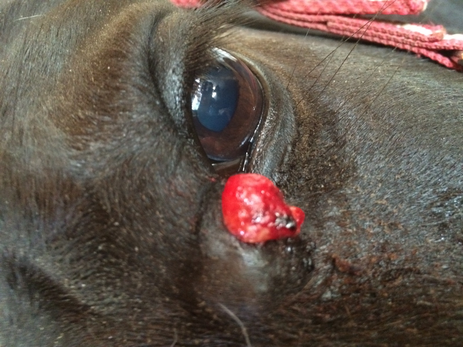 Sirco habe ich als Fohlen gekauft und wir haben uns bisher gemeinsam durch seine Flegeljahre geschlagen. Es war nicht einfach... Ca. Ende 2014, Sirco war damals also 4 1/2-jährig, entdeckte ich eine kleine Erhebung an seinem Augenlid. Erbsengross, dunkel, haarlos. Ich war nicht sonderlich beunruhigt, abgesehen von der Tatsache, dass das "Ding" an einem dummen Ort in Erscheinung trat. Anfangs 2015 zeigte ich es anlässlich Impfung meinem TA. Er meinte, die "Warze" sollte man möglichst bald behandeln, bevor sie dort wächst und zum Problem wird. Mein Bauchgefühl sagte nein, ich wollte noch etwas Zeit. Nach rund 14 Tagen willigte ich ein, mein Pferd mit einer Salbe behandeln zu lassen, die gem. meinem TA bei ähnlichen Fällen zu Erfolg geführt hat. Später wusste ich dann, dass die "Warze" ein ES ist/war und es sich bei der Salbe um Andara gehandelt haben dürfte. Es gab dann rund 3 Anwendungen und ein Auskratzen der Warze. Sirco liess die Behandlung immer ziemlich ruhig über sich ergehen. Das Ding reagierte mit Entzündung, verschwand dann aber irgendwie fast gänzlich. Aber eben nicht ganz. Tja, ich schmierte etwas Schweizer Honig auf das Ding für die Wundheilung