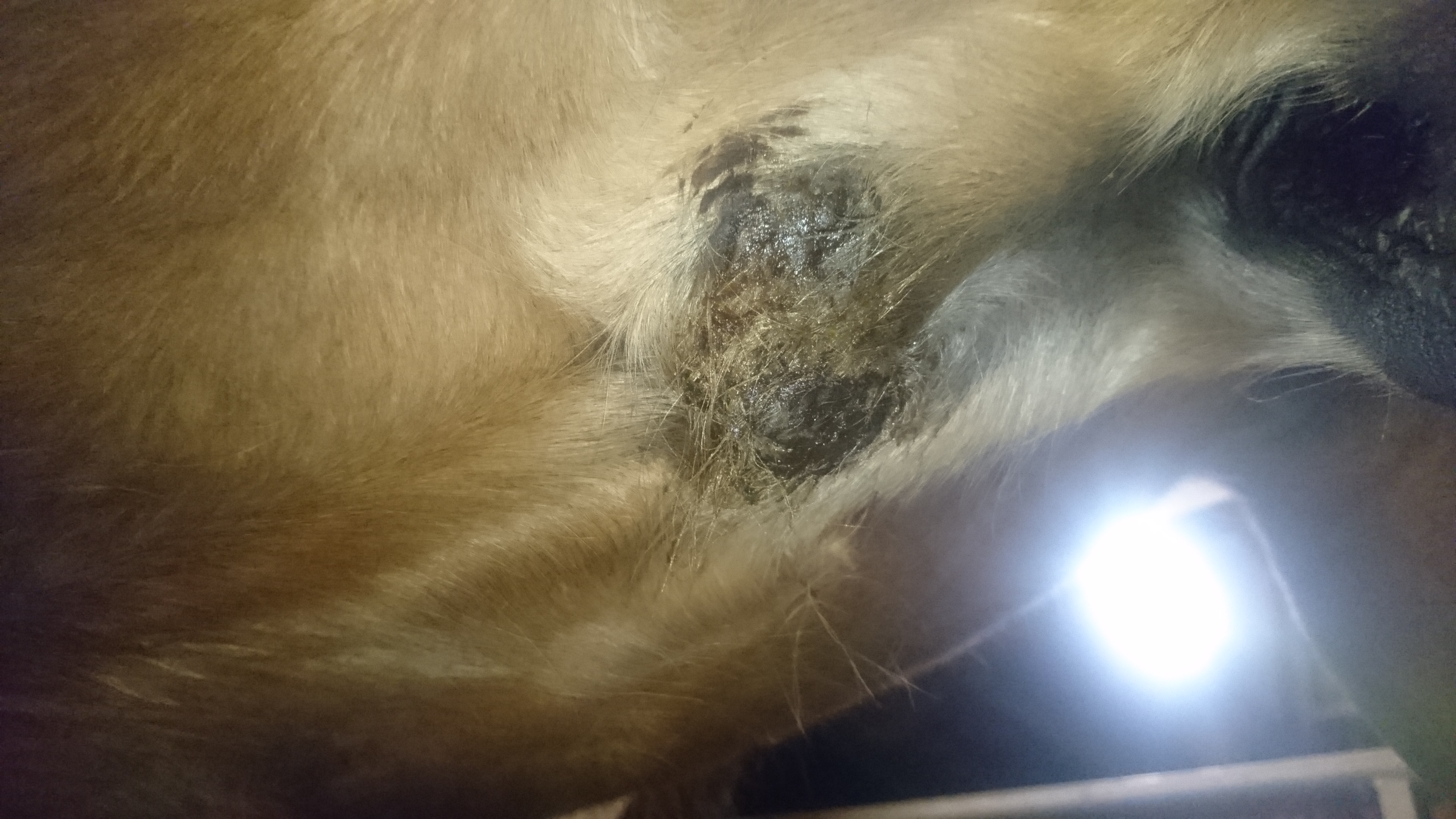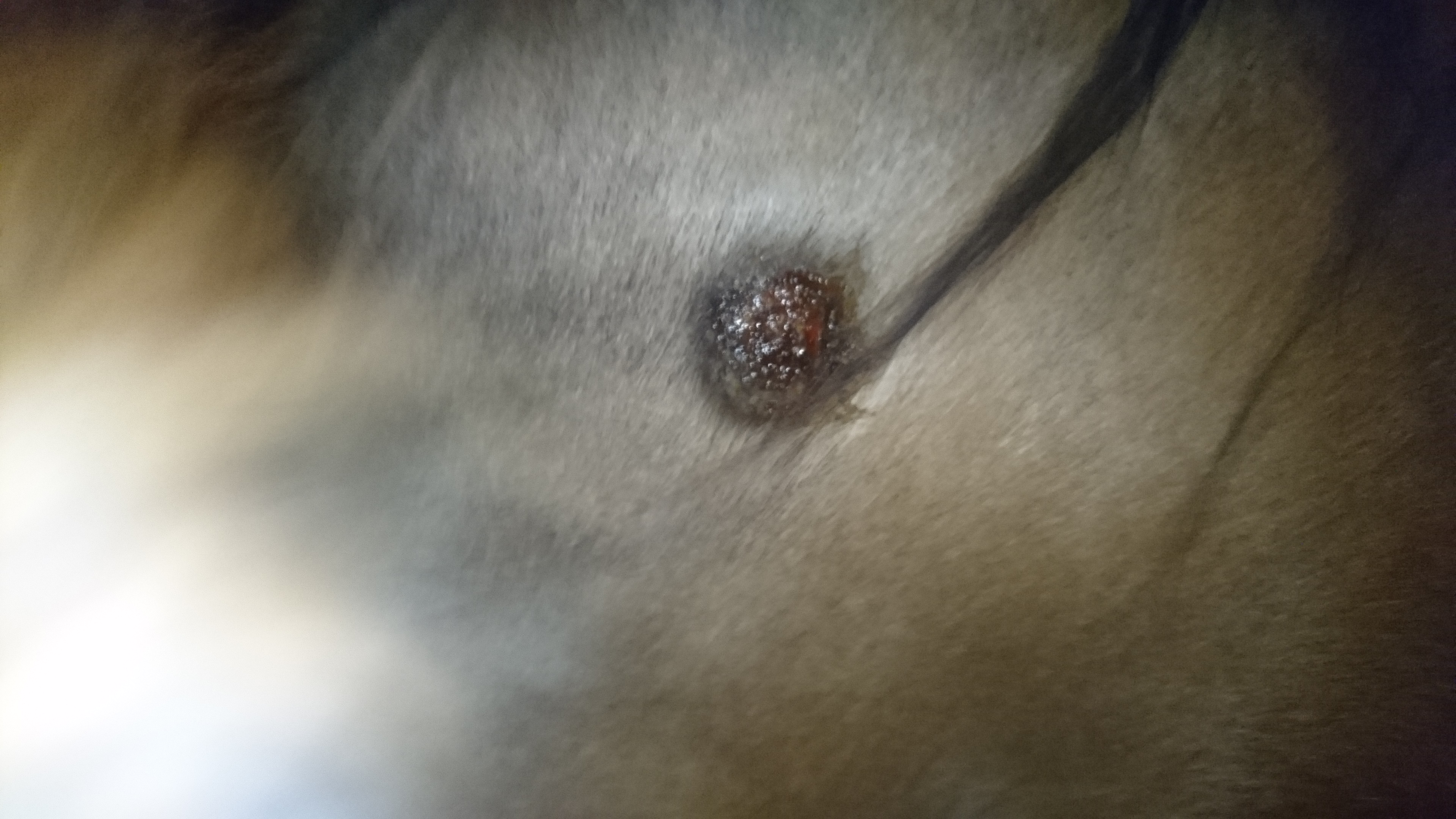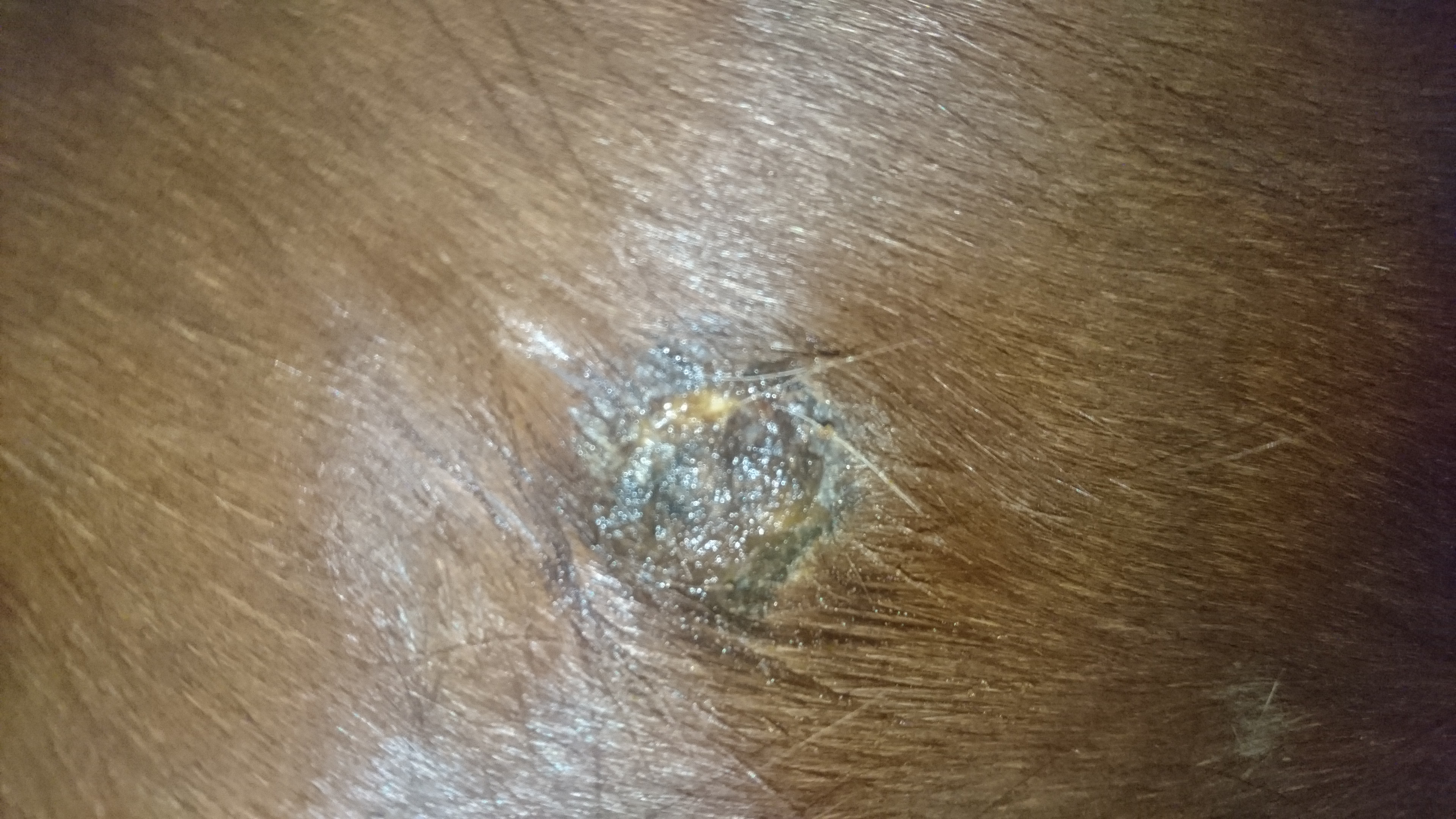 - an der Brust ca. die Größe einer 2 Euro Münze rund relativ flächig. Kruste hat sich schon mehrmals gelöst und fällt