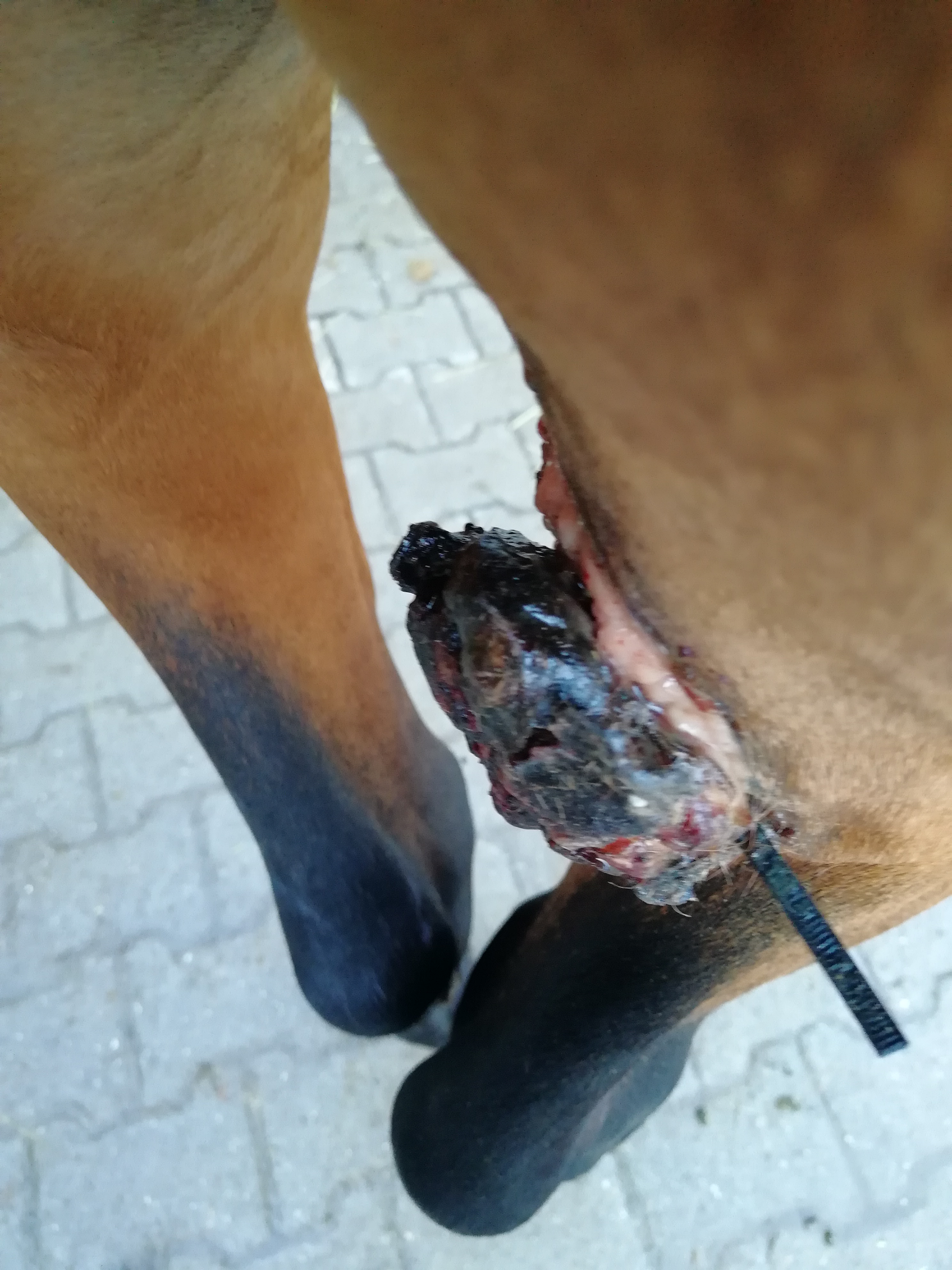 Hab ihn dann letzten Sommer 2malig gegen Heorpes/Pils geimpft und wie mit dem Tierarzt besprochen Herpescreme drauf geschmiert. Ist immer größer geworden. Darauf hab Ichs ne Weile mit Thuja Urtinktur probiert und danach ein knappes Jahr die Dr. Henle Sarkoid Salbe geschmiert. Da diese leider nicht aggressiv genug war bzw nur oberflächlich ätzte, meinte meine Ernährungsberaterin, ich könnte die Salbe auch weg lassen, Lumis Immunsystem würde ES selbst bekämpfen. Seit März fütter ich ihm erst Immunboost und danach Darmfit, Leinsamen, Aloe, Rote Bete und noch vieles mehr. Ich hab sie aus lauter Sorge die letzte Zeit öfter angerufen, sie meinte dass es normal sei, dass ES jetzt erstmal aufblühe und das Eiter und Blut ein gutes Zeichen wären und das ES irgendwann von allein abfiele. Mittlerweile hat ES eine Durchmesser von ca 13 cm und ist so gewuchert, dass man einen Kabelbinder durmrum machen konnte, den ich jetzt fast jeden Tag, ein winziges Stück zu ziehe. ES stirbt ab und fällt bestimmt auch demnächst ab, aber drunter wuchert und eitert ES weiter.